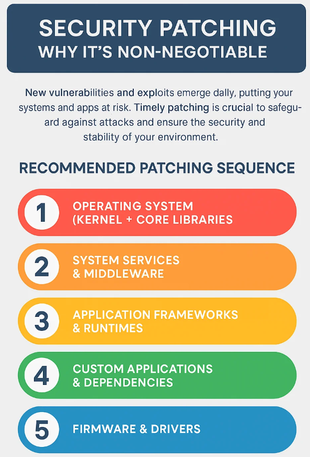 Apply OS-level security patches first—they form the foundation for everything else. - System Services & Middleware